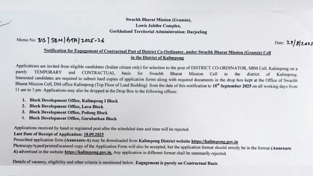 কালিম্পং: পাহাড়ের কোলে কর্মখালি। যাবেন নাকি? বেসরকারি নয়, একেবারে ‘সরকারি চাকরি’। কিন্তু ঘর ছেড়ে যেতে হবে একটু দূর। যেতে হবে সুদূর কালিম্পং। সেখানেই স্বচ্ছ ভারত অভিযান গ্রামীণ সেলে নেওয়া হচ্ছে চুক্তি ভিত্তিক জেলা সমন্বায়ক বা District Co-Ordinator। যার বেতন মোট ২৭ হাজার টাকা।