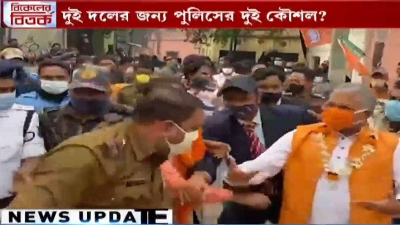 বিজেপি নেতার অভিযোগ তাঁরা বড় কোনও জমায়েত করেননি। কিন্তু পুলিশ শাসক দলের অঙ্গুলিহেলনে কাজ করছে। তিনি বলেন রামনগরে এর চেয়ে বড় সভা করেছে তৃণমূল। বলেন, “যত আইন আমাদের জন্য আছে, তৃণমূলের লোকের গায়ে হাত দিতে পারে না পুলিশ”।