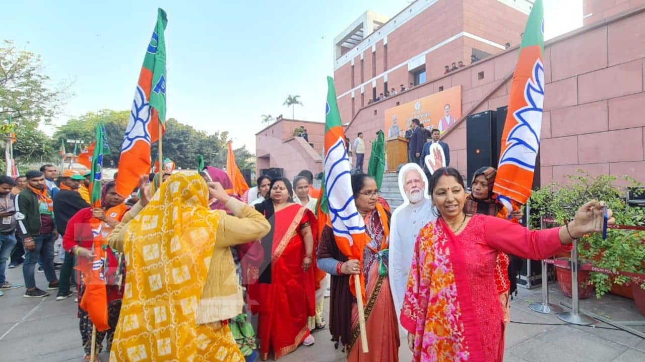 বিজেপির দিল্লির দলীয় অফিসের সামনে এদিন দেখা গেল প্রধানমন্ত্রী নরেন্দ্র মোদীর কাটআউটও। আর সেই কাটআউটের সঙ্গে সেল্ফি তোলার দৃশ্যও ধরা পড়ল ক্যামেরায়। হাতে পদ্ম পতাকা নিয়ে মোদীর কাটআউটের পাশে দাঁড়িয়ে সেল্ফি তোলার হিড়িক মহিলা সমর্থকদের।