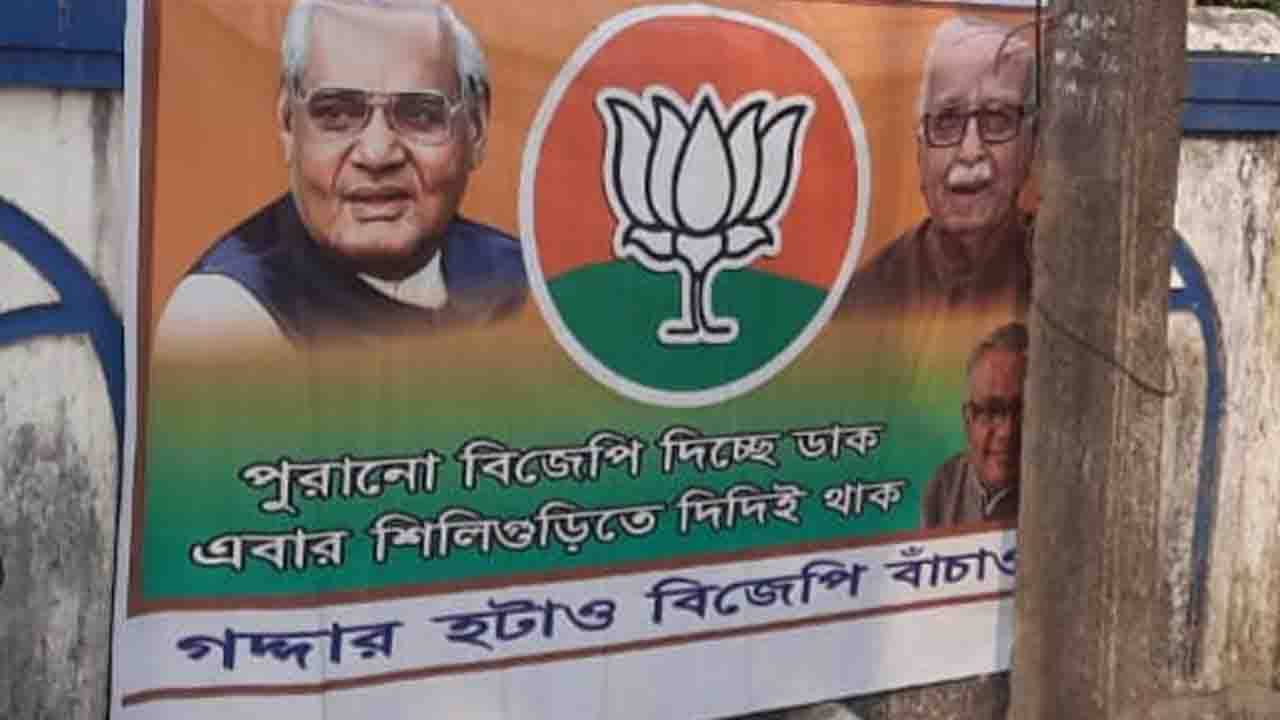 শিলিগুড়ি : একদিকে তৃণমূলের (TMC) প্রার্থী তালিকাকে কেন্দ্র করে ঘাসফুল শিবিরে বিভ্রান্তি চরমে। মনোনয়ন জমা দেওয়ার দিন এসে গেলেও একাধিক পুর এলাকায় প্রার্থী বনিয়ে বিভ্রান্তি কাটেনি। দলের অন্দরে সংঘাতের কানাঘুষোও শোনা যাচ্ছে। এরই মধ্যে পুরনিগমের ভোট ঘিরে প্রকাশ্যে আসছে গেরুয়া শিবিরের অন্তর্দ্বন্দ্ব। শিলিগুড়িতে বিজেপির একটি পোস্টার থেকে সেই বিষয়টাই উঠে আসছে। শিলিগুড়ি পুরনিগমের ভোটের (Siliguri Municipal Election) আর মাত্র তিন দিন বাকি। তার আগেই ২৪ নম্বর ওয়ার্ডে বিজেপি (BJP) প্রার্থী শঙ্কর ঘোষের (Shankar Ghosh) বিরুদ্ধে পড়ল পোস্টার। পোস্টার পড়েছে আদি বিজেপির নামে। সেই পোস্টারে রয়েছে অটল বিহারী বাজপেয়ী ও লালকৃষ্ণ আদবানির ছবি। আর তাতে লেখা, ‘এবার শিলিগুড়িতে দিদিই থাক।’
