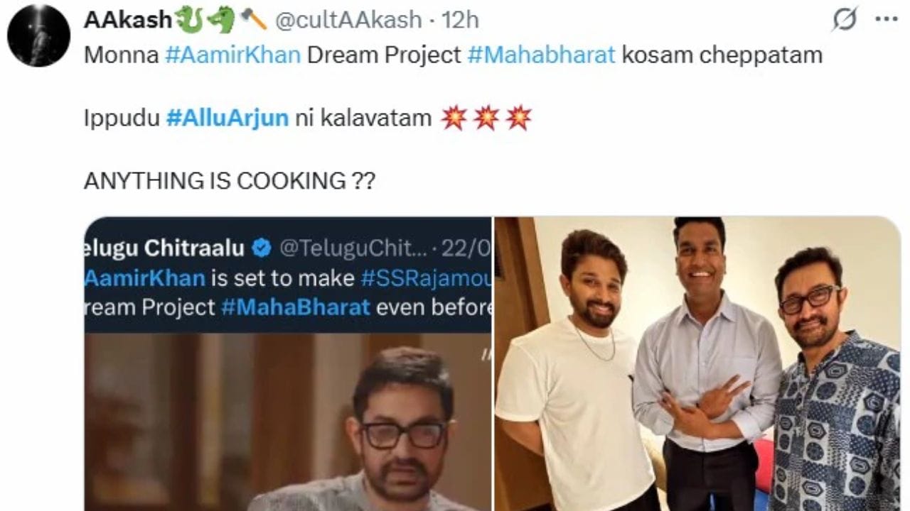 কয়েকদিন আগেই খবরে আসে আমির খান নাকি খুব শীঘ্রই শুরু করবেন তাঁর ড্রিম প্রোজেক্ট মহাভারত। যার পরিচালক এস এস রাজা মৌলি। শোনা যাচ্ছে, এই ছবি নিয়ে কথা বলতেই হয়তো আমিরের বাড়িতে পৌঁছেছেন আল্লু অর্জুন। তবে গুঞ্জন শোনা গেলেও, এই নিয়ে এখনও মুখ খোলেননি আমির বা আল্লু কেউই।