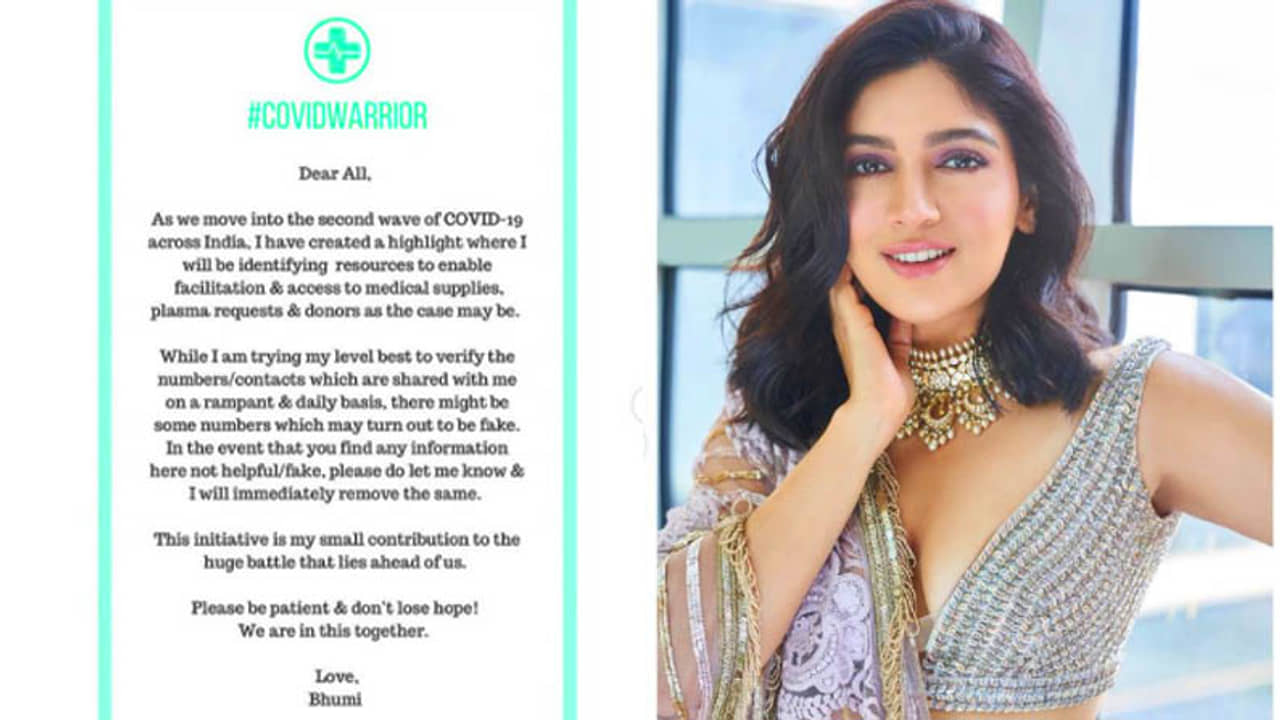বালা খ্যাত অভিনেত্রী তাঁর ইনস্টাগ্রাম হ্যান্ডেলে ফ্যানদের উদ্দেশ্যে জানান চিকিৎসার জন্য কোনও সাহায্যের জন্য তাঁরা ডিরেক্ট মেসেজের মাধ্যমে অভিনেত্রীর সঙ্গে যোগাযোগ করতে পারে। ভূমি লেখেন, ‘সুধীবৃন্দ, আমরা দেশ জুড়ে কোভিড ১৯–এর সেকেন্ড ওয়েভের মধ্যে দিয়ে চলেছি, আমি জানাতে চাই চিকিৎসা সরবরাহ এবং প্লাজমা দানের জন্য প্রচেষ্টা শুরু করছি। প্লাজমা দাতাদের এই উদ্যোগে সামিল করতেও চলেছি’।