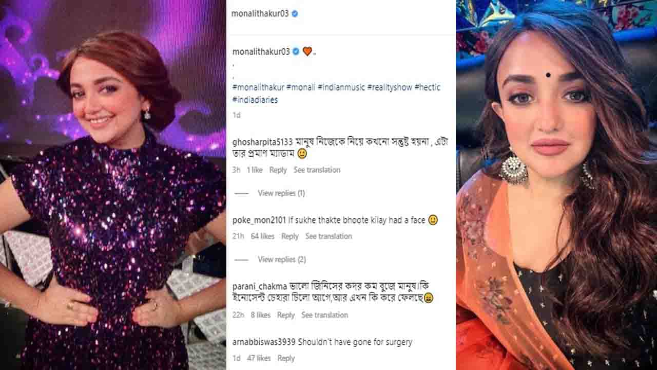 বাংলা এবং হিন্দি বিনোদন জগতের অনেকেই মনে করেন লক্ষ্মীঠাকুরের মতো মুখশ্রী গায়িকা-অভিনেত্রী মোনালী ঠাকুরের। হিন্দি প্লেব্যাকের পাশাপাশি বেশ কিছুটা সময় ধরে গানের রিয়্যালিটি শোয়ের বিচাকরের গুরুদায়িত্ব সামলাচ্ছেন মোনালী। সেই গানের মঞ্চ থেকেই তিনটি ছবি মোনালী শেয়ার করেছিলেন শুক্রবার (১০.০২.২০২৩)। তাতে অনেকের দেখে মনে হয়েছে তিনি ঠোঁটে অস্ত্রোপচার করে আকার পরিবর্তন করার চেষ্টা করেছেন। যেটাকে বলা হয় ‘লিপ জব’। সেই ছবি নেটমাধ্যমে ছড়িয়ে পড়তেই ভয়ানক মন্তব্য় আসা শুরু করেছে নেটিজ়েনদের থেকে। শেয়ার করা ছবিতে মোনালী কিন্তু একটিবারের জন্যেও বলেননি যে, তিনি প্লাস্টিক সার্জারি করিয়েছেন ঠোঁটে । হতেও তো পারে ঠোঁটের মেকআপটাই ওভাবে করা হয়েছে। সে যাই হোক না কেন, প্রতিক্রিয়া এমন সব এসেছে… দেখুন নিজে চোখেই!