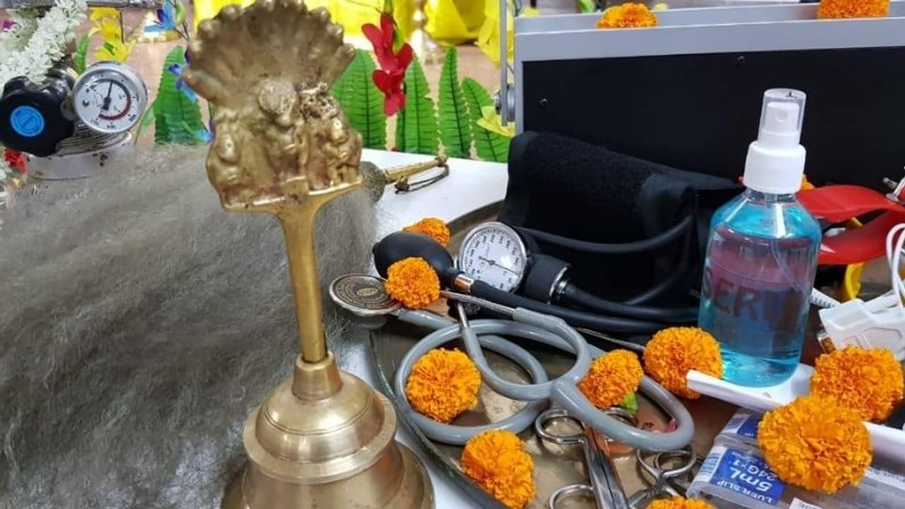 পুজোর ডালায় সাজানো রয়েছে ডাক্তারি সরঞ্জাম। হোম যজ্ঞ আয়োজন করা হয়েছে।বাগুইআটির বন্ধুমহল ক্লাবে পুজো পুজো ভাব। হোম যজ্ঞ পুরোহিতের মন্ত্র পাঠ। হাজির ক্লাবের মহিলা সদস্যরাও। দুর্গাপুজোর সঙ্গে সম্মান জানালো লেডি ডক্টর ঝুমা শিকদারকে। ক্লাব সম্পাদক পার্থ সরকার বললেন, “দশ হাতে সামলাচ্ছেন। পুজো করা হলো তাদের অস্ত্রশস্ত্র। মানে স্টেথোস্কোপ প্রেসার মাপার যন্ত্র সিরিঞ্জ ইত্যাদি।”