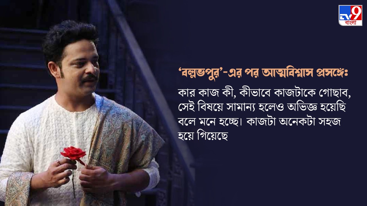 হম, শেষ করা থিয়েটার এই দু’টো কাজের আগে। ফলে এখন তো অনেক কিছু পাল্টেছে। বুঝতে পারছি কোথায়, কী করা উচিত। আরও গভীরে গিয়ে বিষয়গুলোকে সহজভাবে ধরতে পারছি। কার কাজ কী, কীভাবে কাজটাকে গোছাব, সেই বিষয়ে সামান্য হলেও অভিজ্ঞ হয়েছি বলে মনে হচ্ছে। কাজটা অনেকটা সহজ হয়ে গিয়েছে। মানে আমার কাছে প্রোডাকশনের ছবিটা স্পষ্ট হয়ে গিয়েছে। আর নিজেকে অভিনেতা হিসেবে সামান্য পরিণত মনে করছি। অভিনেতা তথা দলের কর্মী হিসেবে অভিজ্ঞতা অনেক বেড়েছে। বিশেষ করে ‘বল্লভপুর’ করার পর, নিজের মধ্যে একটা আত্মবিশ্বাস জন্মেছে। বাকিটা তো দর্শক বলবে।