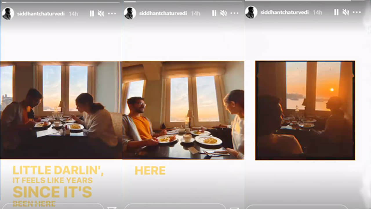 শুটিং ফাঁকে ‘চিলিং’-এর ছবি ইনস্টা স্টোরিতে পোস্ট করলেন সিদ্ধান্ত। টেবিলের এক প্রান্তে বসে দীপিকা, পরনে সাদা লুজ টপ। আর তাঁর ঠিক উল্টো দিকে বসে পরিচালক শকুন। আর দু’জনের মাঝে জানলার ফাঁক দিয়ে নীলচে আকাশ আর এক ফাঁলি রোদ উঁকি মারছে। ইনস্টা রিলে পর পর ছবি সাজিয়ে এক ভিডিও বানিয়েছেন সিদ্ধান্ত। ব্যাকগ্রাউন্ডে চলছে গান। বিটলস ব্যান্ডের ‘হিয়ার কামস দ্য সান’।