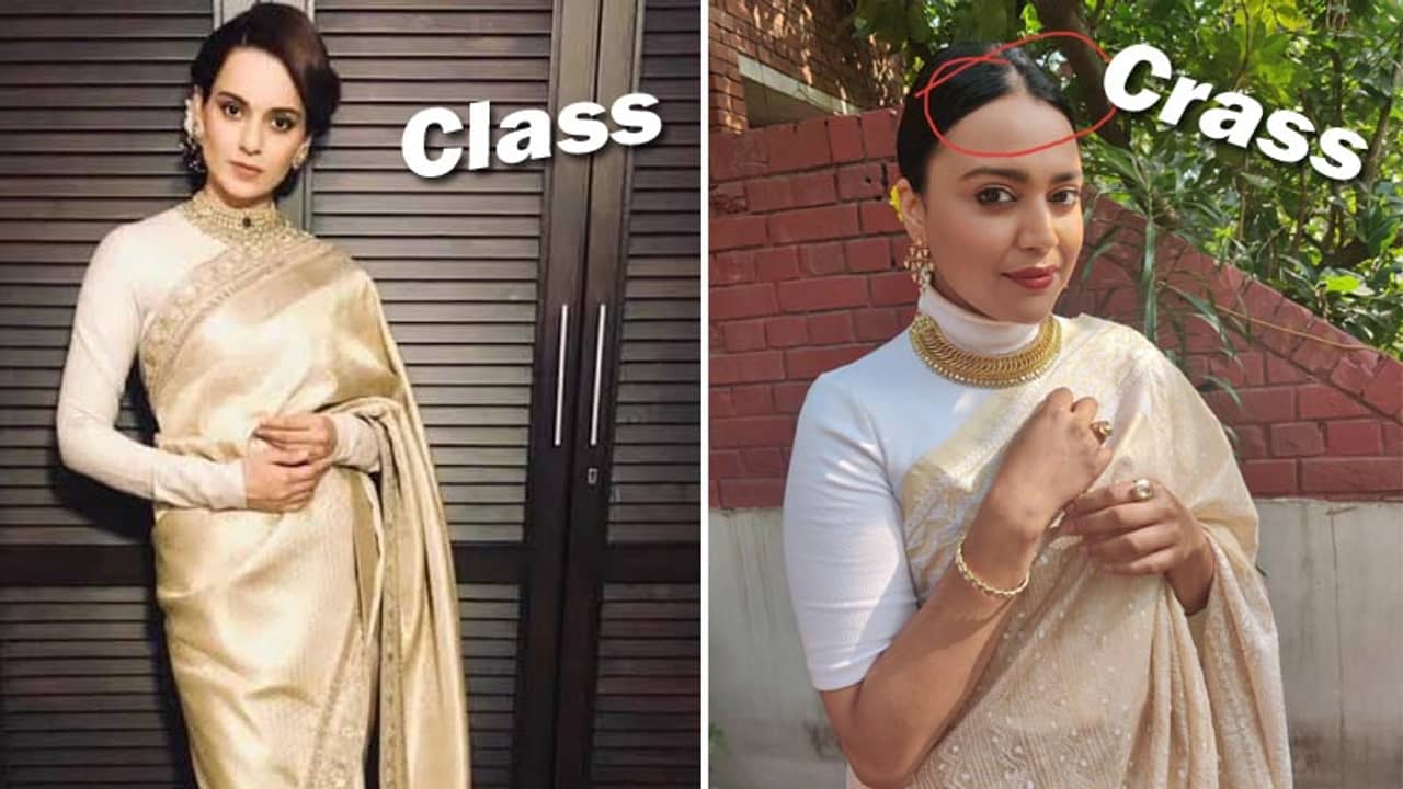 রোববার ভীষণ বোর হচ্ছিলেন কন্ট্রোভার্সি কুইন। টুইটারে আরেক অভিনেত্রীর ছবি রিটুইট করতেই শুরু হল বিতর্ক। স্বরা ভাস্করের সঙ্গে নিজের এক ছবি রিটুইট করলেন কঙ্গনা রাণাওয়াত (Kangana Ranaut)। ছবিতে দু’জনেই গোল্ডেন রঙের শাড়ি পরে রয়েছেন সঙ্গে সাদা রঙের ব্লাউজ, গলায় এক বড় নেকলেস। কঙ্গনার ছবিতে সবকিছু ঠিকঠাক থাকলেও স্বরার ছবিতে ওঁর সিঁথির কাছে লাল রঙের গোল মার্ক রয়েছে। যেন বোঝানো হয়েছে স্বরার মাথার চুল উঠে যাচ্ছে। এবং দুই ছবির উপরে লেখা দু’টো শব্দ। কঙ্গনার ছবির উপরে লেখা ‘ক্লাস’ এবং স্বরার ছবির উপরে লেখা, ‘ক্রাস’ (কর্কশ)।