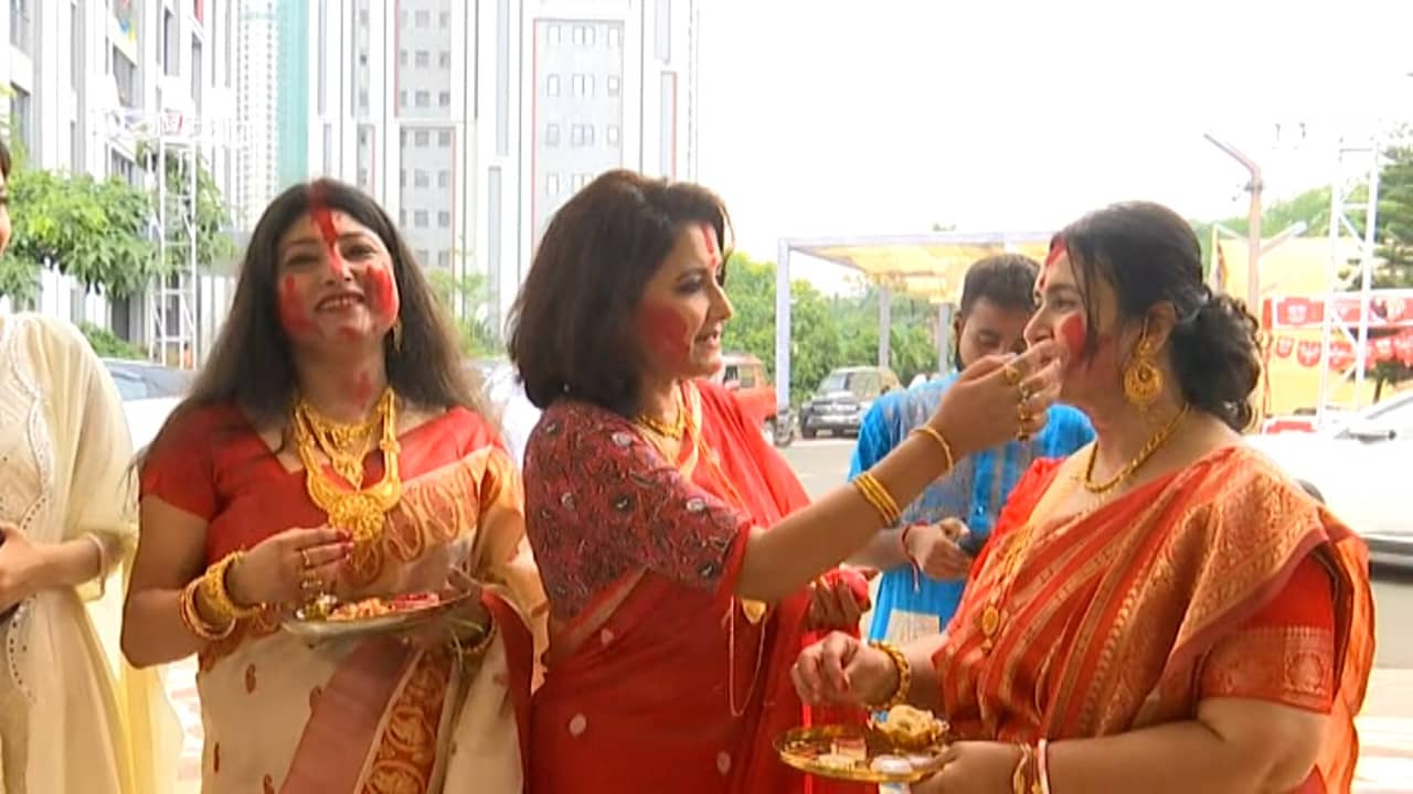 প্রতিবাদ সঙ্গে নিয়েই দেখতে দেখতে উৎসবের মরসুম শেষ। শনিবার থেকেই পড়ে গিয়েছে দশমী। ইতিমধ্যেই প্রতিমা বিসর্জন শুরু হয়েগিয়েছে। তারই মাঝে রবিবার সকলে আরবানাতে সিঁদুর খেলতে দেখা গেল রচনা বন্দ্যোপাধ্যায়কে। লাল শাড়ি পড়ে, গালে সিঁদুর মেখে দেখা গেল সাংসদকে। সকলকে জানালেন শুভ বিজয়ার শুভেচ্ছা। বললেন, আসছে বছর আবার। পুজোর মাঝেই অনশনকারীদের উদ্দেশে দিয়েছিলেন বার্তা।