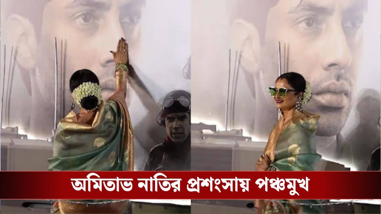 রেড কার্পেটে পাপারাজ্জিদের তোলা ভিডিওতে দেখা যায়, রেখা প্রথমে প্রয়াত অভিনেতা ধর্মেন্দ্রর একটি পোস্টারের সামনে থেমে যান। তিনি নীরবে হাতজোড় করে মাথা নত করে কয়েক মুহূর্ত শ্রদ্ধা জানান। এরপর তিনি পোস্টারে থাকা অগস্ত্যের ছবির দিকে এগিয়ে যান—প্রথমে স্নেহভরে তাঁর মুখে হাত রাখেন এবং তারপর আশীর্বাদস্বরূপ একটি উড়ন্ত চুম্বন ছুড়ে দেন।