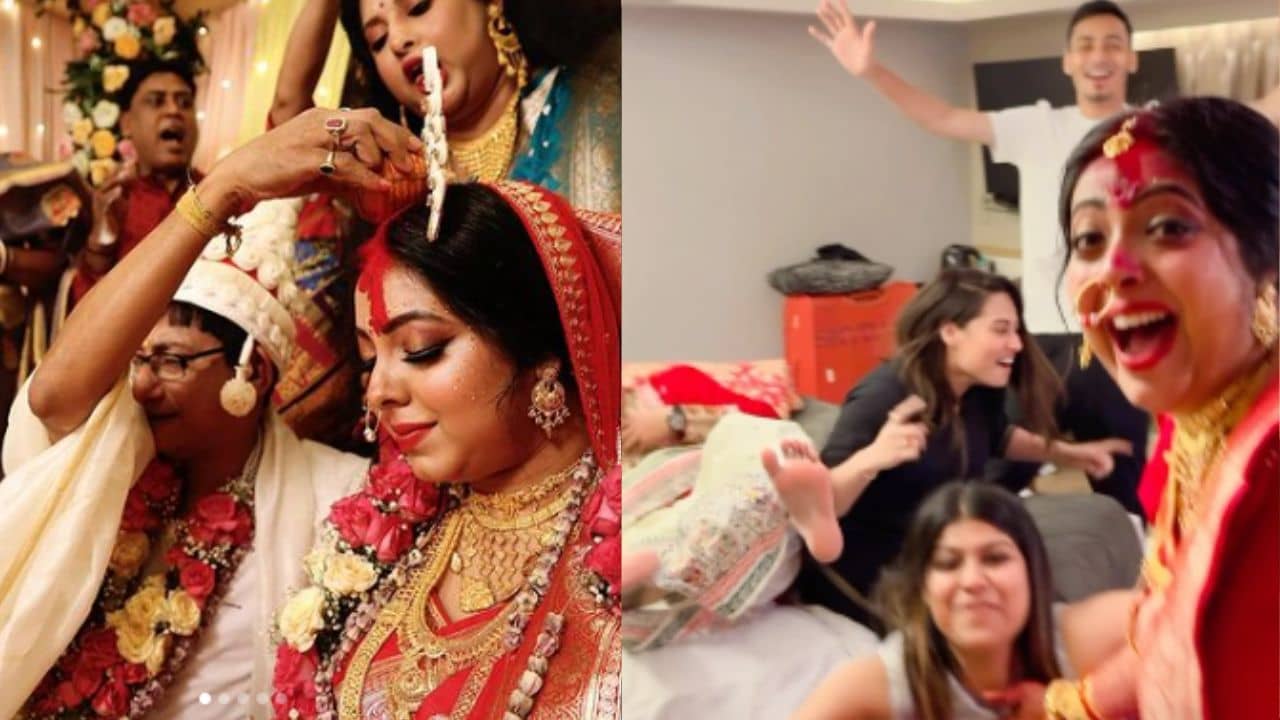 আর তাতেই ভাইরাল এঅই জুটি। বর্তমানে তাঁদের নিয়ে বিভিন্ন মহলের একশ্রেণি বাঁকা কথা বললেও তাঁরা যে এই বিয়েতে, এই সিদ্ধান্তে বেশ খুশি ও ভাল আছেন, তা বারবার TV9 বাংলাকে জানিয়েছেন। তাই বিয়ের আসরে শ্রীময়ীর হাসি মুখে নাচ অনেকেরই নজর কাড়ল। সকলে মিলে যেভাবে উচ্ছ্বাসের সঙ্গে এদিন সেলিব্রেট করলেন, তা এক কথায় রাতারাতি নেটপাড়ায় ভাইরাল। তালিকা থেকে বাদ পড়ল না বাসর ঘরের ছবিও। বাসরে অন্দরমহেল ঠিক কী চলছিল, দরজা খুলে নিজেই দেখালেন শঅরীময়ী। সব বন্ধুদের সঙ্গে বসে কাঞ্চন, সকলে মিলে শ্রীময়ীকে ঢুকতে দেখেই উচ্ছ্বাসের সঙ্গে যে প্রতিক্রিয়া দিলেন, তা দেখে শ্রীময়ীর মুখে ফুঁটল হাসি।