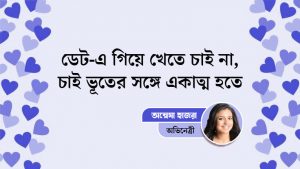 ডেটিংয়ে যাব, এদিকে খাওয়া-দাওয়া হবে না, তা কী করে হয়? কিন্তু আমি খেতে চাই না। চাই সেই ভূতের সঙ্গে একাত্ম হতে। আমি তার কাছ থেকে গল্প শুনতে চাই। সে আমাকে তাঁর জীবনের নানান কাহিনি কানের কাছে এসে বলে যাবে। ভূতের সঙ্গে ডেটিংয়ে গিয়ে খাওয়া তো হবেই,তবে আমার কৌতূহল অন্যদিকে। সে কোথা থেকে এসেছে, আমাকেই বা কেন ভাল লাগল! কীভাবে ভূত হল, আমি এগুলো আগে জানতে চাইব। প্রচুর প্রচুর গল্প শুনে চাই।