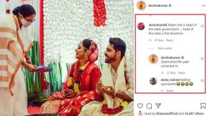 মমতা বন্দ্যোপাধ্যায়ের ছবিটি শেয়ার করার পর ক্যাপশনের ভুল সংশোধন করতে হয়েছে দেবলীনাকে। ছবিতে দেখা যাচ্ছে, দেবলীনা ও তাঁর স্বামী, তথা অভিনেতা ও উত্তমকুমারের নাতি গৌরব চট্টোপাধ্যায় বিয়ের পিঁড়িতে বসে রয়েছেন। সেখানে মুখ্যমন্ত্রী এসে তাঁদের হাতে তুলে দিচ্ছেন উপহার। দেবলীনা প্রথমে ক্যাপশনে লিখেছিলেন, “যখন রাজ্যের প্রধান আমাদের বিশেষ দিনে আশীর্বাদ করতে এসেছিলেন…” (When the Head of the State was present to bless you on your special day..)