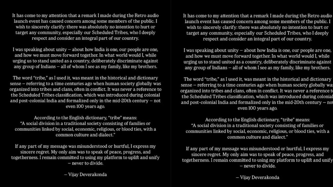 বিজয়ের এই আদিবাসি মন্তব্য নিয়েই বিতর্ক শুরু। ট্রাইবাল লইয়ার্স অ্যাসোসিয়েশন বাপুনগর-এর তরফ থেকে অভিযোগও দায়ের হয়েছে বিজয়ের বিরুদ্ধে। তাঁদের অভিযোগ পহেলগাঁও এবং পাকিস্তানের প্রসঙ্গে আদিবাসিদের টেনে, আদিবাসিদের অপমান ও অশ্রদ্ধা করেছেন দক্ষিণী নায়ক। দ্রুত তাঁকে ক্ষমা চাইতে হবে।