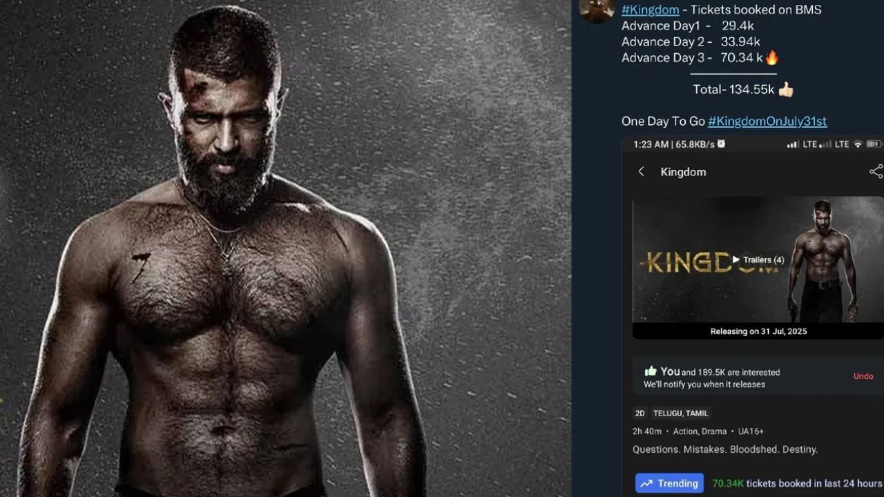 বুক মাই শো থেকে পাওয়া তথ্য অনুযায়ী, অগ্রিম বুকিং শুরু হওয়ার পর প্রথম দিন ২৯.৪ হাজার, দ্বিতীয় দিন ৩৩.৯৪ হাজার এবং তৃতীয়দিনে ৭০.৩৪ হাজার টিকিট বিক্রি হয়েছে। শুধু তাই নয়, গোটা তেলেঙ্গনায় ৬১২ শোয়ের জন্য মোট এক লাখ অগ্রিম টিকিট কাটা হয়েছে। সুতরাং বোঝাই যাচ্ছে, রিলিজের আগেই কিংডম বুঝিয়ে দিচ্ছে, এই ছবি সবাইকে টেক্কা দিতে তৈরি।