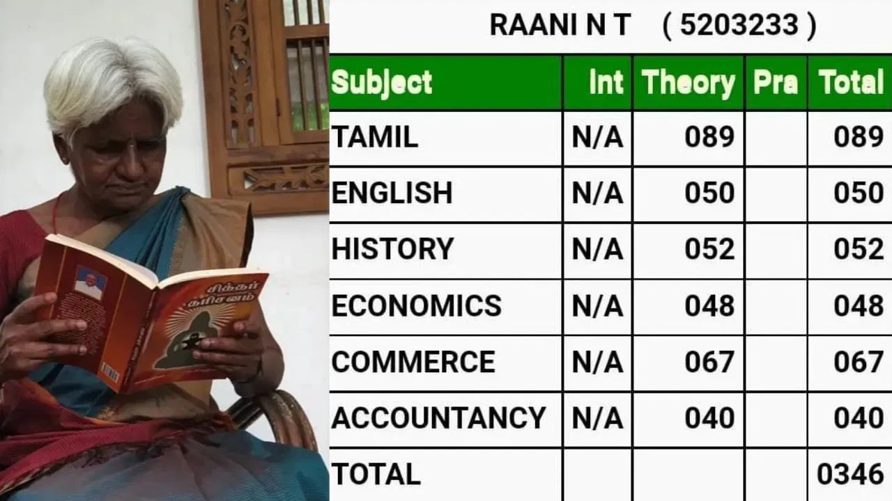 বৃহস্পতিবার তামিলনাড়ুর ক্লাস টুয়েলভের পরীক্ষার ফল প্রকাশিত হয়েছে। ৭.৫৩ লক্ষ পরীক্ষার্থী পরীক্ষা দেন। পাশের হার ৯৫.০৩ শতাংশ। সফল পরীক্ষার্থীদের তালিকায় জ্বলজ্বল করছে বছর সত্তরের রানির নাম। ৬০০ নম্বরের পরীক্ষায় ৩৪৬ পেয়েছেন তিনি। সবচেয়ে বেশি নম্বর পেয়েছেন তামিল ভাষায়। ইংরেজিতে ৫০, ইতিহাসে ৫২, অর্থনীতিতে ৪৮, বাণিজ্যে ৬৭ এবং অ্যাকাউন্টেন্সিতে ৪০ নম্বর পেয়েছেন।