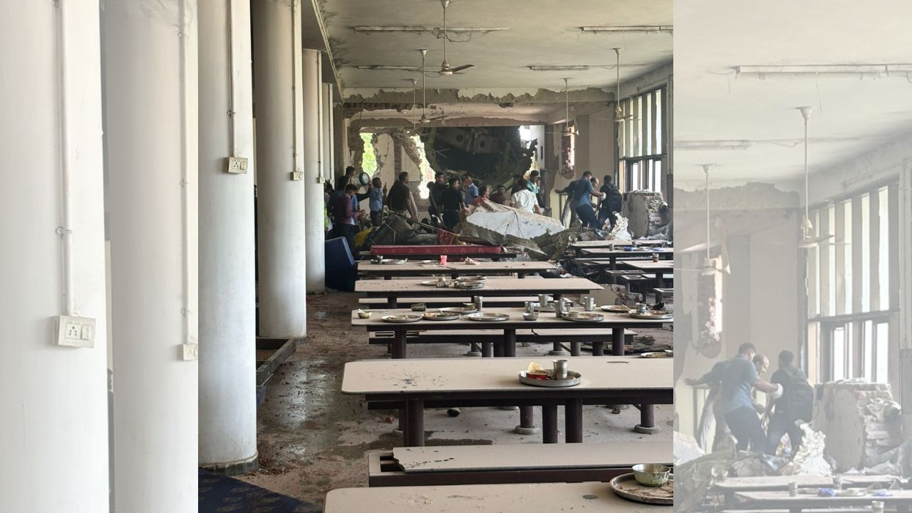 হস্টেলের দেওয়াল ভেঙে ঢুকে গিয়েছে বিমানের অংশ। ভেঙে গিয়েছে ছাদ ও দেওয়ালের অংশ। ক্যান্টিনের ছবিও সামনে এসেছে। সেখানে দেখা যাচ্ছে, টেবিলের উপর পড়ে রয়েছে থালা, গ্লাস। ছড়িয়ে-ছিটিয়ে রয়েছে খাবার। বোঝাই যাচ্ছে, খাওয়া-দাওয়া চলছিল ক্যান্টিনে।