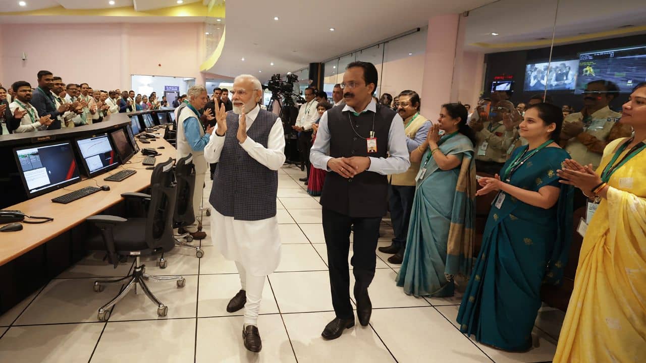 ইসরোর সদর দফতরে প্রধানমন্ত্রী মোদী।Image Credit source: PTI