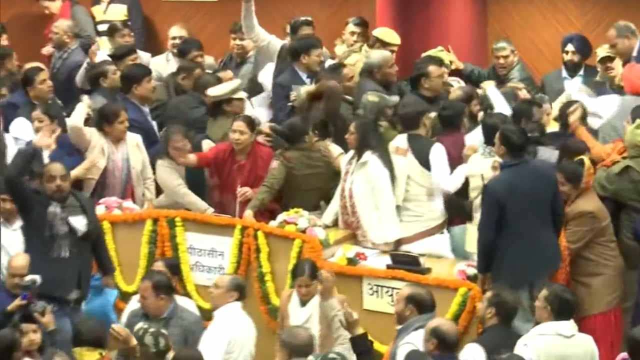 #WATCH | Delhi: BJP and AAP councillors clash with each other and raise slogans against each other ahead of Delhi Mayor polls at Civic Centre. pic.twitter.com/ETtvXq1vwM