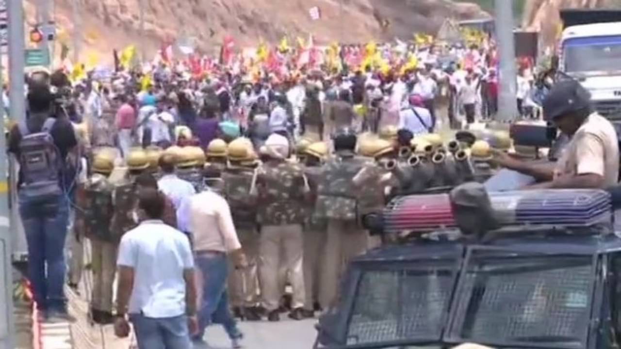 #WATCH | Farmers push barricades aside in Haryana’s Panchkula as they march towards Governor’s residence in Chandigarh to submit a memorandum seeking repeal of new farm laws pic.twitter.com/6uNRo9cn28