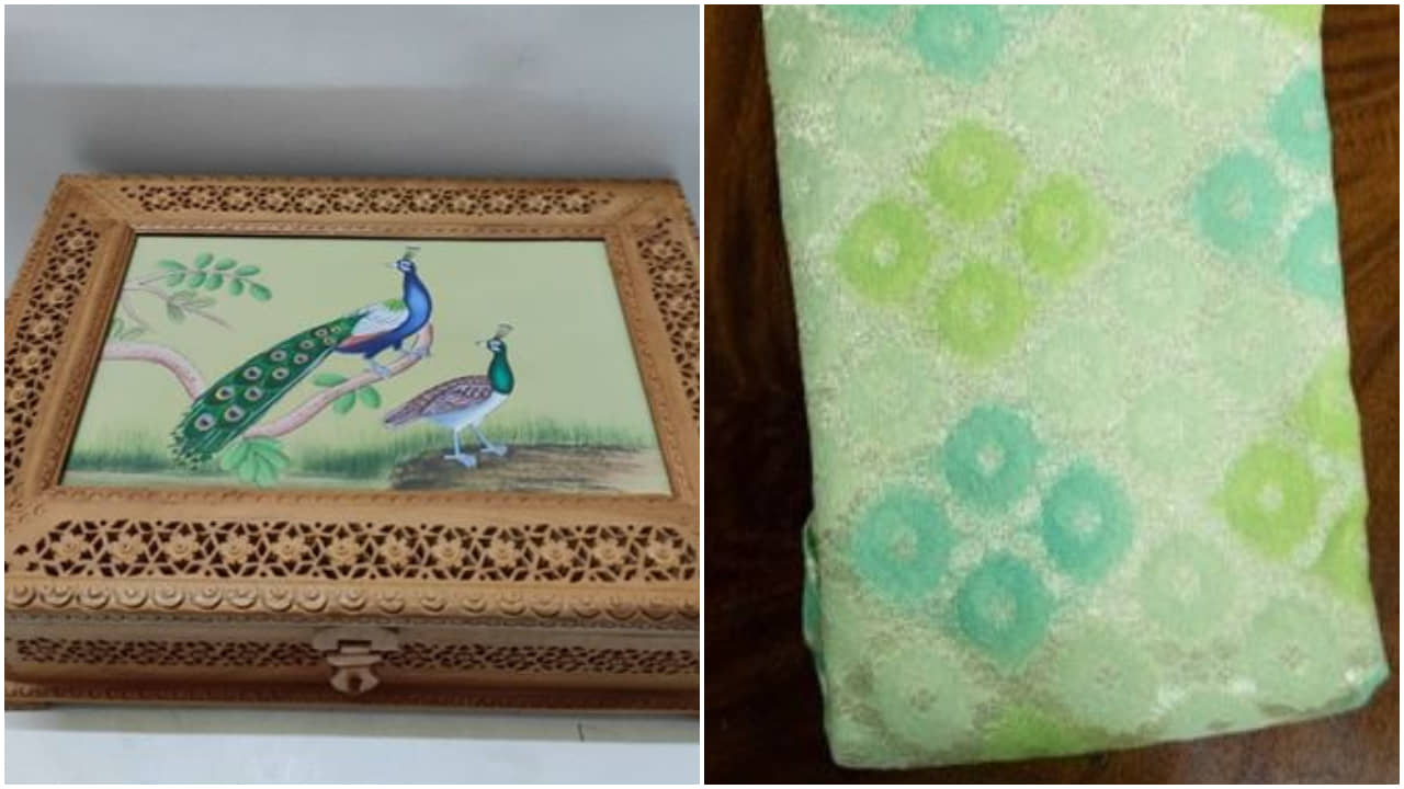 মরিশাসের প্রধানমন্ত্রীর স্ত্রীকে সেগুন কাঠের বাক্সে একটি ইক্কত কাপড়ের স্টোল উপহার দিয়েছেন প্রধানমন্ত্রী মোদী। ওড়িশার তাঁতিরা এই বিশেষ সিল্ক কাপড় তৈরি করেন। ইক্কতের স্টোলটিতে বাঁধনির কাপড় রয়েছে। বারোশ শতকে এই শিল্পের সূচনা হয়েছিল। সেগুন কাঠের বাক্সটি তৈরি করেছেন, গুজরাটের কারিগররা।