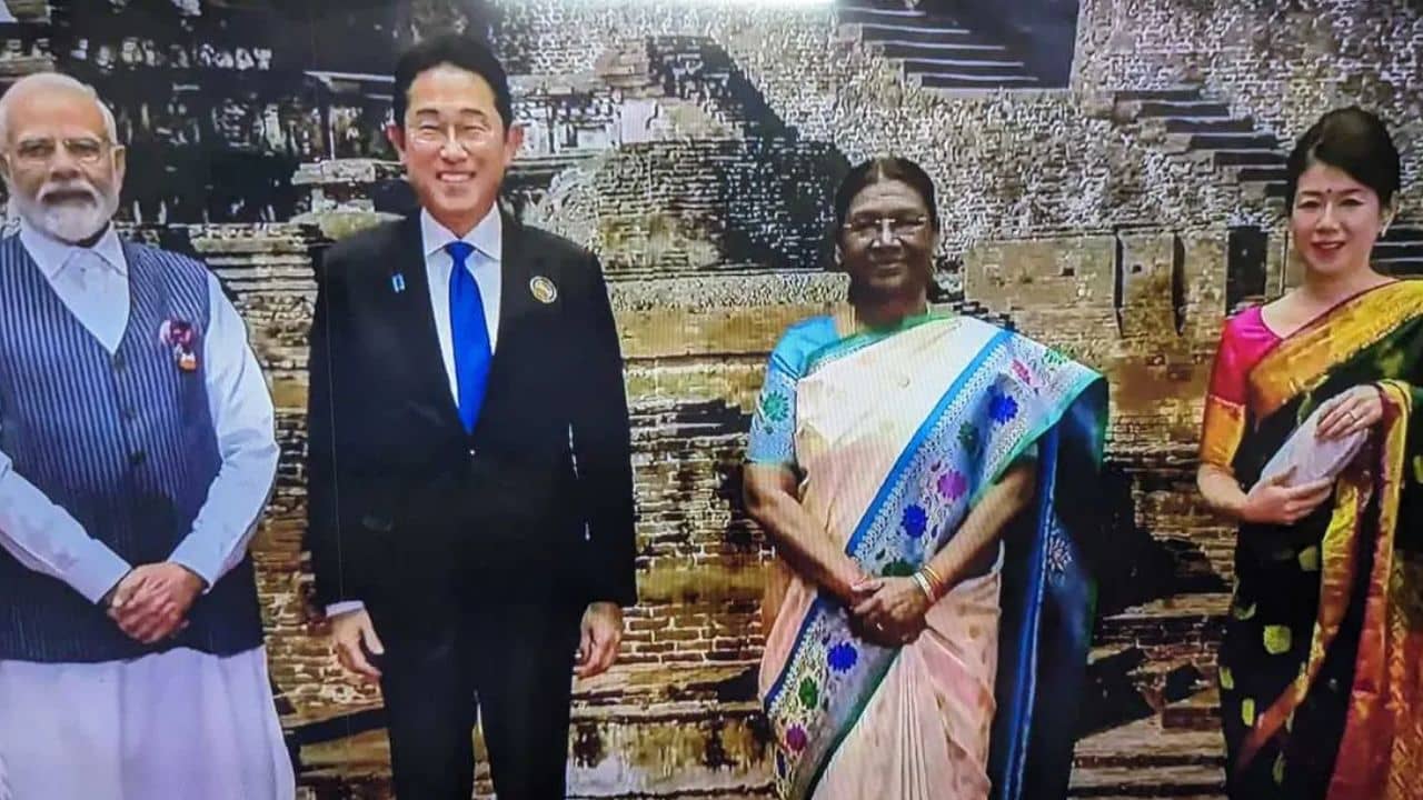 কালো রঙের কাঞ্জিভরম শাড়ি পরিহিত জাপানের ফার্স্ট লেডি এদিনের রাষ্ট্রপতি ভবনের নৈশভোজের মধ্যমণি হয়ে উঠেছিলেন। ভিডিয়োটিতে দেখা যাচ্ছে, জাপানের প্রধানমন্ত্রী ফুমিও কিশিদার সঙ্গে তাঁর স্ত্রী ইয়োকো কিশিদা কালো রঙের কাঞ্জীবরণ শাড়ি পড়ে রাষ্ট্রপতি ভবনে ঢুকছেন। ভবনের গেটের সামনে দাঁড়িয়ে তাঁদের স্বাগত জানাচ্ছেন খোদ রাষ্ট্রপতি দ্রৌপদী মুর্মু এবং প্রধানমন্ত্রী নরেন্দ্র মোদী। তারপর তাঁদের সঙ্গে রাষ্ট্রপতি ও প্রধানমন্ত্রী ছবিও তোলেন। কাঞ্জীবরণ শাড়ি পরে জাপানের ফার্স্ট লেডিও যেন এদেশেরই অংশ হয়ে উঠেছেন। তিনি যে বিদেশি অতিথি, তা একঝলক দেখে বোঝা যাচ্ছে না।
