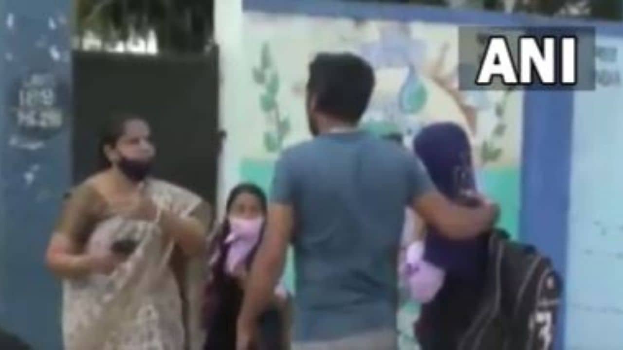 #WATCH | K'taka: Argument b/w parents & a teacher outside Rotary School in Mandya as she asked students to take off hijab before entering campus