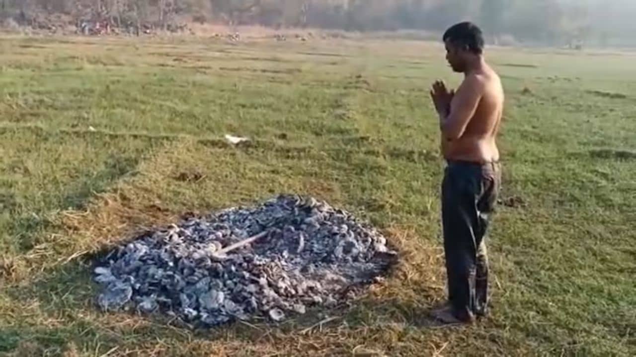সোশ্যাল মিডিয়ায় ভাইরাল হওয়া ভিডিয়োটিতে দেখা যাচ্ছে, গ্রামের মাঠে জ্বলন্ত কয়লার মাঝে একটি লোহার রড রাখা রয়েছে। ওই ব্যক্তি স্নান করে এসে, হাতজোড় করে অগ্নিকুণ্ডের চারপাশে ঘোরেন। তারপর জ্বলন্ত কয়লার মধ্যে রাখা সেই লোহার রড হাতে করে সরিয়ে ফেলেন।