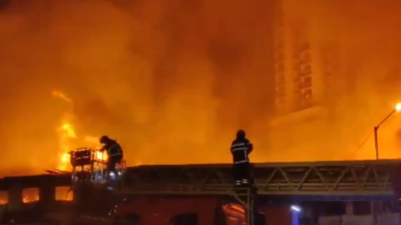 #WATCH | Mumbai, Maharashtra: A lever-4 fire broke out at a restaurant in Kamathipura, Grant Road at 2 am. A total of 16 fire engines and 2 lines from a high-rise building are in operation. Due to flames, a nearby mall and a high-rise building have been vacated. No injuries have… https://t.co/3ibZ35kDRN pic.twitter.com/d61kyPUt3f