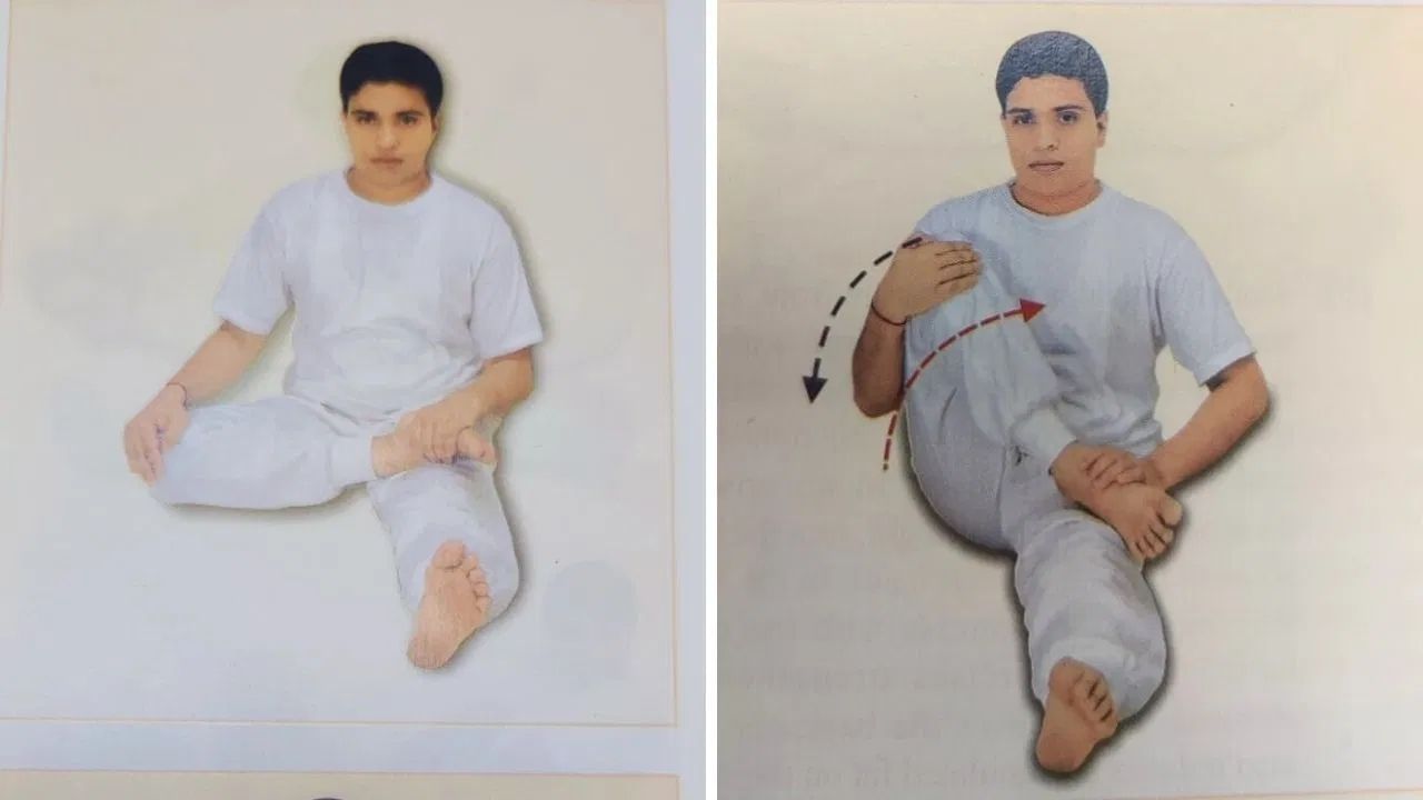 রামদেবের এই বইতে পায়ের ব্যথা প্রতিরোধের জন্য যে আসনগুলির কথা বলা হয়েছে, তা দণ্ডাসনে বসে করতে হবে। অর্থাৎ, মাদুরের উপর বসে পা সামনের দিকে ছড়িয়ে দিন এবং উভয় হাতের তালু মাটিতে রেখে আরামে বসুন। এখানে দেওয়া আচার্য বালকৃষ্ণের ছবি দেখে আপনি ভঙ্গি বুঝতে পারবেন।