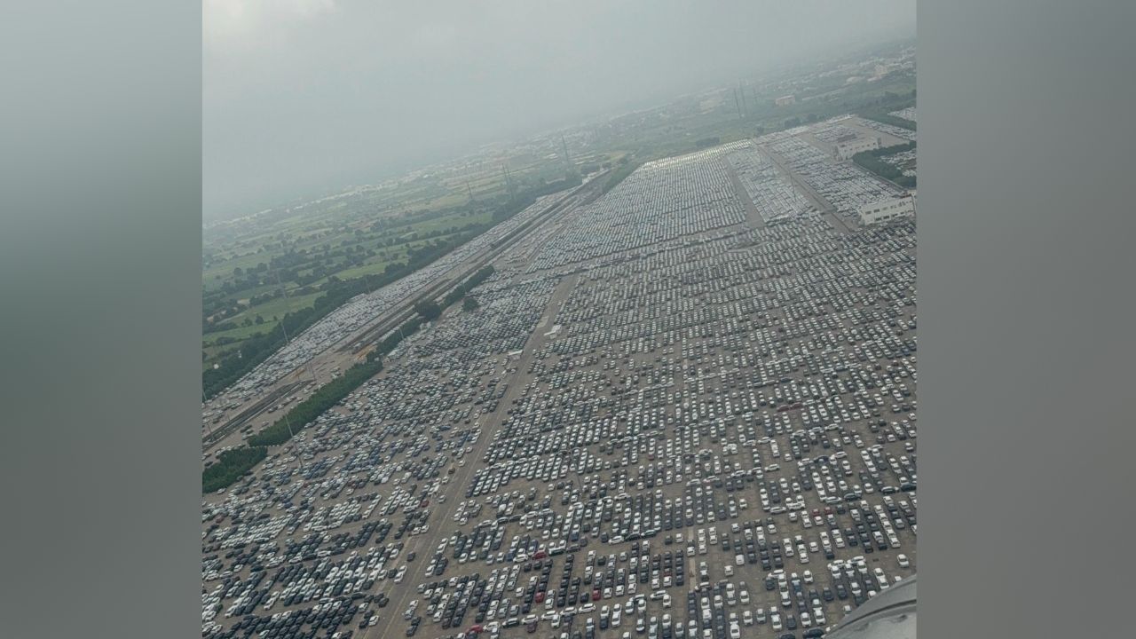 কারখানায় সার দিয়ে দাঁড়িয়ে গাড়ি। হেলিকপ্টার থেকে ছবিটি তোলা হয়েছে।