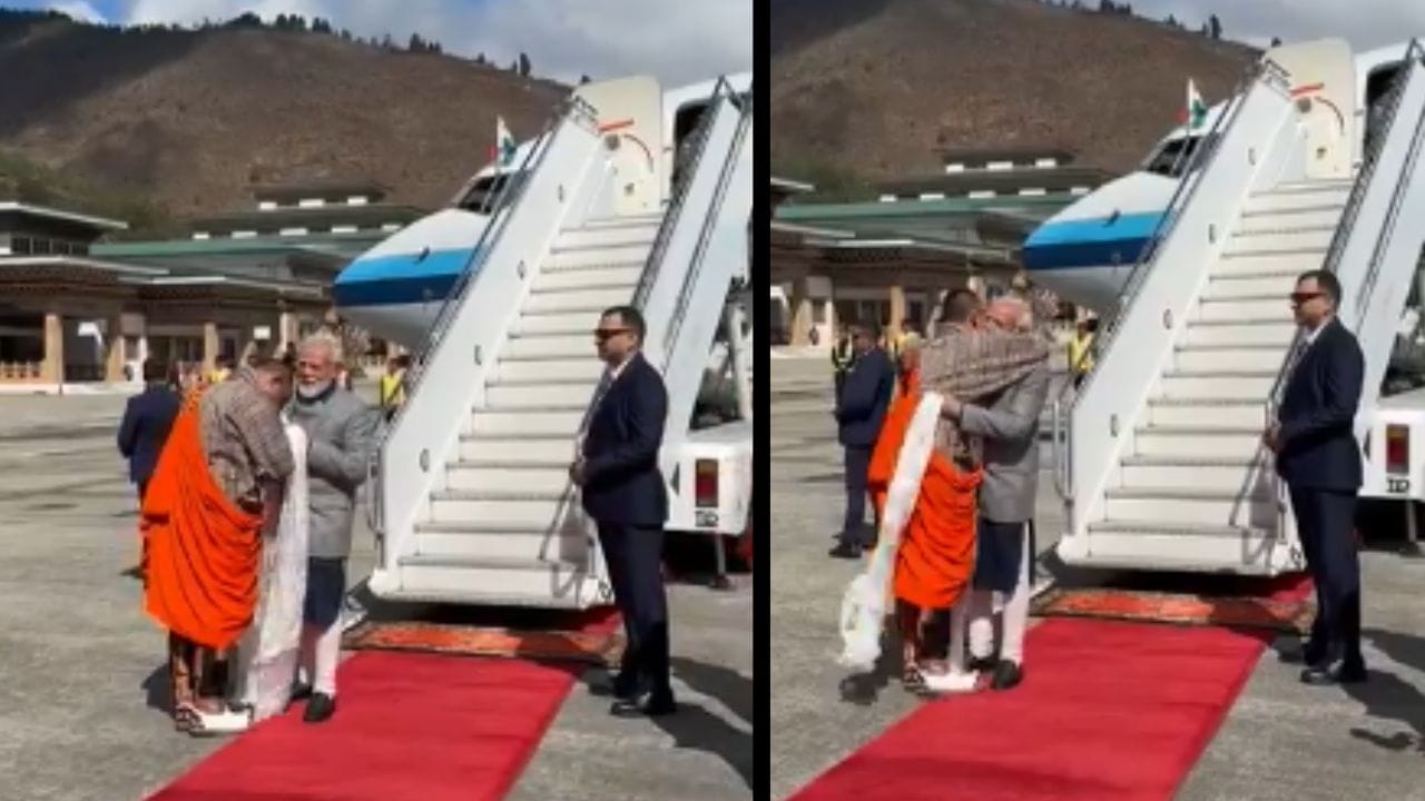 #WATCH | Paro, Bhutan | A warm embrace between Bharat and Bhutan: Bhutan’s PM Tshering Tobgay welcomes PM Modi as he lands at Paro airport. pic.twitter.com/tKYHIgEsQc