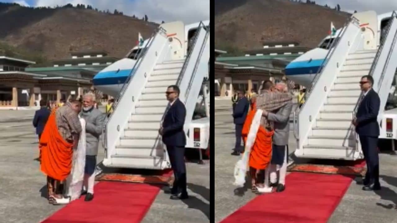#WATCH | Paro, Bhutan | A warm embrace between Bharat and Bhutan: Bhutan’s PM Tshering Tobgay welcomes PM Modi as he lands at Paro airport. pic.twitter.com/tKYHIgEsQc