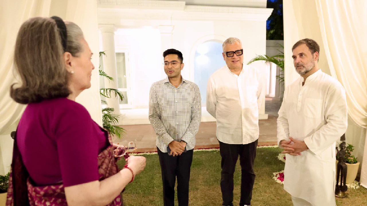 নয়া দিল্লি: রাহুল গান্ধীর বাসভবনে নৈশভোজের বৈঠকে যোগ দিলেন অভিষেক বন্দ্যোপাধ্যায়। শুধু অভিষেক নয়, দেখা গেল বিরোধী শিবিরের একঝাঁক মুখকে। উপস্থিত ছিলেন সনিয়া গান্ধী, প্রিয়ঙ্কা গান্ধীও। বৈঠকে সস্ত্রীক দেখা গেল অখিলেশ যাদব তেজস্বী যাদব, সস্ত্রীক উদ্ধব ঠাকরে। দেখা গেল ফারুক আব্দুল্লাহ, এম এ বেবি, শরদ পাওয়ার, সুপ্রিয়া সুলে, কানিমঝি, টি আর বালুকেও। সূত্রের খবর, এদিন রাতে সেখানে ছিলেন প্রায় ৫০ জন নেতা-নেত্রী। এও জানা যাচ্ছে খাওয়া-দাওয়ার মাজে মূল আলোচ্য বিষয়ই চিল SIR.
