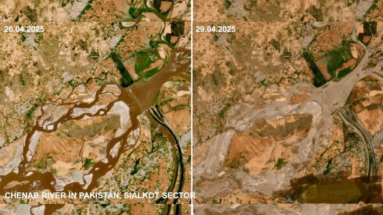 স্যাটেলাইট ছবিতে স্পষ্ট দেখা যাচ্ছে সিন্ধু জল চুক্তির স্থগিত নির্দেশ সুস্পষ্টভাবেই কার্যকর হচ্ছে। শিয়ালকোটের কাছে চেনাব নদীর দুই দৃশ্য। ২৬ তারিখে যেখানে জলের প্রবাহ দেখা যাচ্ছে। সেখানেই ২৯ তারিখে একরকম জলশুন্য চেনাব। স্যাটেলাইট ইমেজে স্পষ্ট সেই ছবি। এই ছবি পাকিস্তানের স্নায়ুর চাপ আরও অনেকটা বাড়াবে বলেই মনে করছেন আন্তর্জাতিক সম্পর্ক বিশেষজ্ঞদের একটা বড় অংশ।