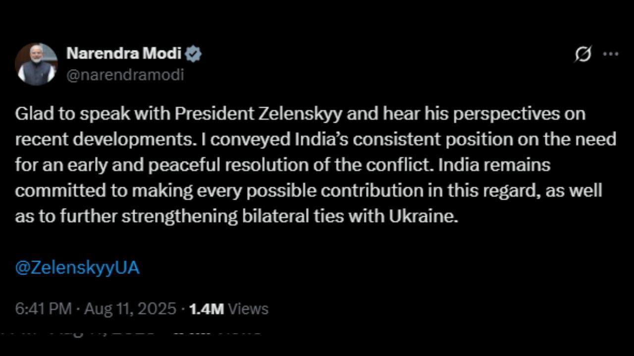 এদিন প্রধানমন্ত্রীকে ফোন করে প্রথমে রবিবার ইউক্রেনের একটি বাস স্টেশনে রাশিয়ার চালানো হামলার কথা বলেন জেলেনস্কি। তিনি জানান, ওই হামলার ফলে কত মানুষ আহত হয়েছেন। সেই আলাপচারিতার পর ভারতীয় সময় অনুযায়ী সোমবার সন্ধ্যা নাগাদ এক্স হ্যান্ডেলে একটি পোস্ট করেন তিনি। তাতে জেলেনস্কি লেখেন, “ভারতের প্রধানমন্ত্রীর সঙ্গে ফোনে অনেকক্ষণ কথা হল। বর্তমান সময়ে দাঁড়িয়ে প্রতিটি গুরুত্বপূর্ণ বিষয় নিয়ে আমরা আলোচনা করেছি। আলোচনা হয়েছে আমাদের দ্বিপাক্ষিক সমঝোতা ও কূটনৈতিক অবস্থান নিয়েও। আমি কৃতজ্ঞ যে এই কঠিন সময়েও উনি আমাদের সমর্থন জুগিয়ে যাচ্ছেন।”