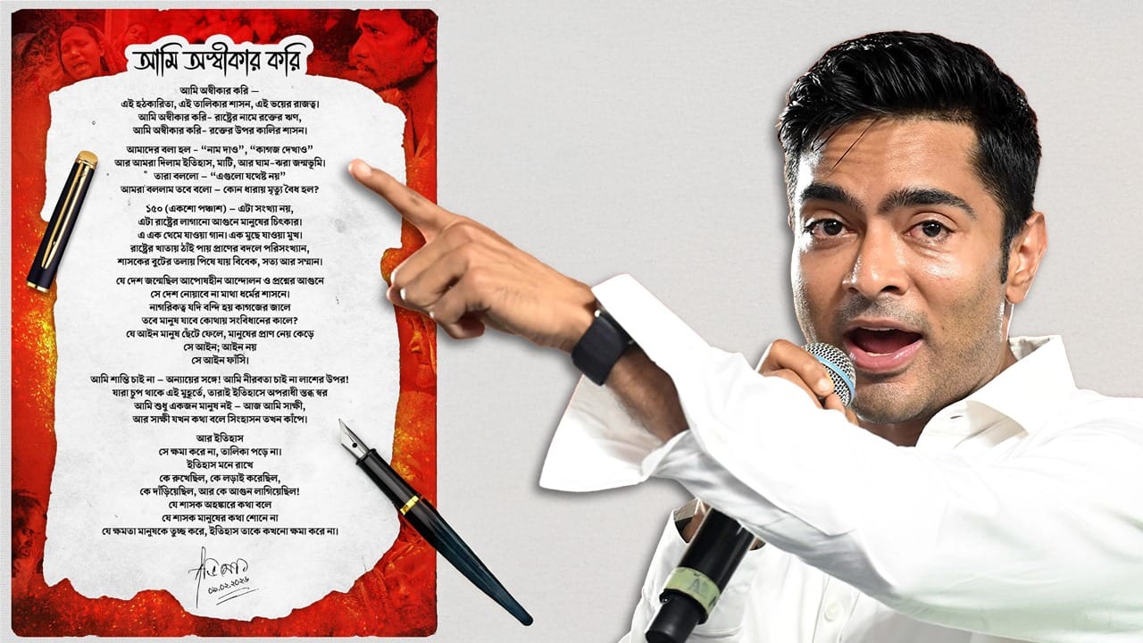 এবার তৃণমূল সুপ্রিমোর মতোই কলম ধরলেন দলের সেনাপতি তথা সর্বভারতীয় সাধারণ সম্পাদক অভিষেক বন্দ্যোপাধ্যায়। বাংলার ভোটার তালিকার নিবিড় পরিমার্জন প্রক্রিয়া বা এসআইআর নিয়ে কবিতা লিখলেন তিনি। সোমবার নিজেই সমাজমাধ্যমে ‘আমি অস্বীকার করি’ শীর্ষক কবিতাটি পোস্ট করেছেন অভিষেক। যার ছত্রে ছত্রে রয়েছে কেন্দ্রীয় বিরোধিতা, সঙ্গে রাষ্ট্রব্য়বস্থা নিয়ে ক্ষোভ।