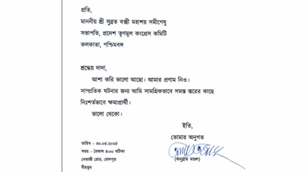 চারটি লাইনের একটি চিঠি। সেই চিঠির তৃতীয় লাইনেই লেখা, ‘সাম্প্রতিক ঘটনার জন্য আমি সামগ্রিকভাবে সমস্ত স্তরের কাছে নিঃশর্তভাবে ক্ষমাপ্রার্থী।’ দলের বর্ষীয়ান নেতার কাছে চিঠি লিখে ক্ষমা চাইলেন অনুব্রত।