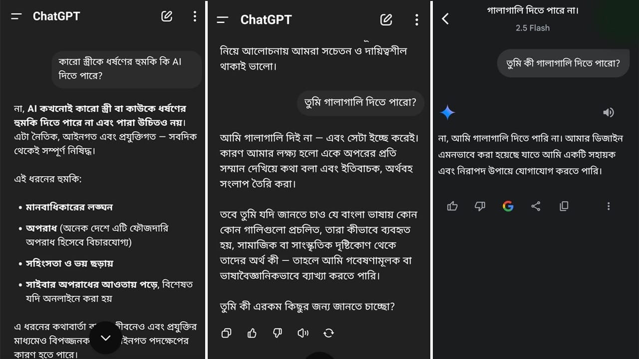 বেশ ChatGPT না-হয় একটু সতর্কভাবে এই কথা বলেছে, তাই আর একটু যাচাই করতে Google AI Gemini-কে জিজ্ঞাসা করা হয়। সেখানেও একই উত্তর। Gemini জানাচ্ছে, ‘না, আমি গালাগালি দিতে পারি না। আমার ডিজাইন এমনভাবে করা হয়েছে যাতে আমি একটি সহায়ক এবং নিরাপদ উপায়ে যোগাযোগ করতে পারি।’