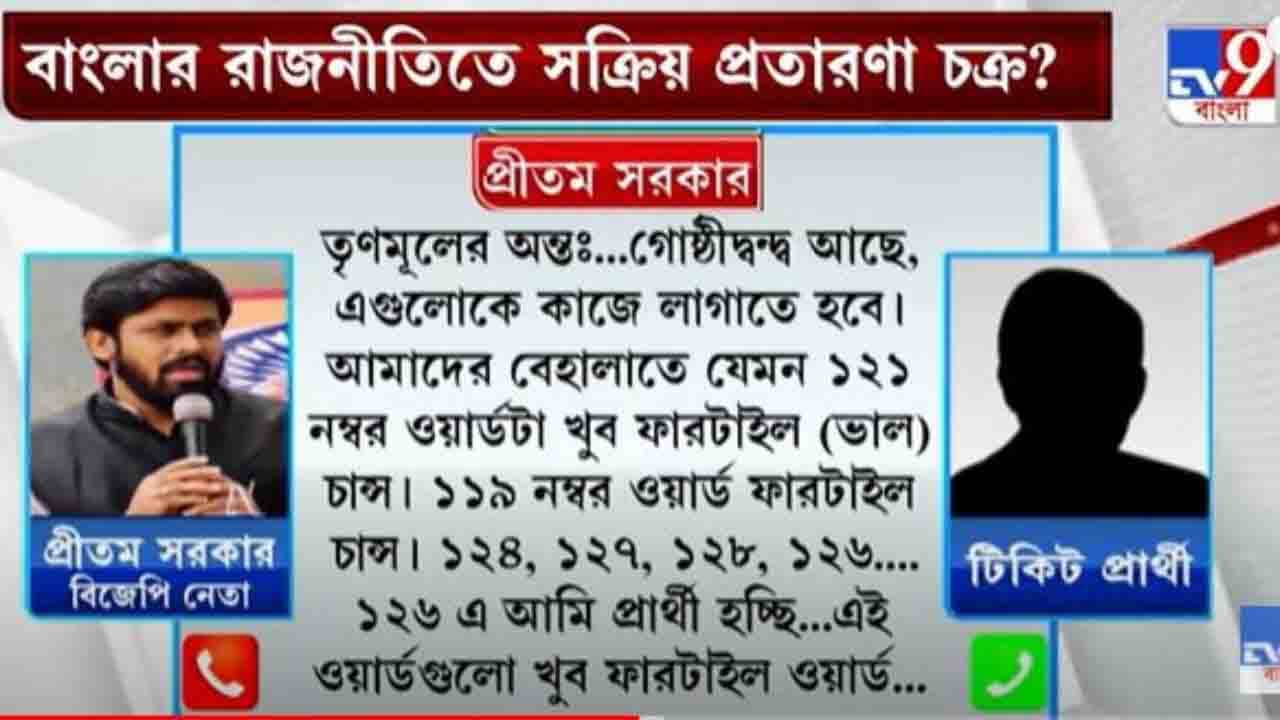 ঠিক কী শোনা গিয়েছে অডিয়ো ক্লিপে? ভাইরাল হওয়া ওই অডিয়ো ক্লিপে শোনা গিয়েছে, দুই ব্যক্তির কথোপকথন। অভিযোগ, ওই দুই কণ্ঠস্বরের একটি বিজেপি যুব নেতা প্রীতম সরকারের। অভিযোগ, বিজেপি যুব নেতা বলে দাবি করা ওই কণ্ঠস্বরে শোনা যাচ্ছে, একজন টিকিট প্রার্থীকে বলা হচ্ছে, “প্রতি ক্যান্ডিটেড ১ লাখ টাকা করে অন্তত দাও”, আরও বলা হচ্ছে, “একদম হবে। এবং সেখানে তৃণমূলের সঙ্গে সেটিং করে জেতানোর যতরকম চেষ্টা, সব করা হবে।” পাশাপাশি, টিকিট প্রার্থীর প্রশ্নের উত্তর দিতেও শোনা গিয়েছে। তবে ওই টিকিট প্রার্থী কে তা জানা যায়নি। অডিয়োটির সত্যতা যদিও যাচাই করেনি TV9 বাংলা।