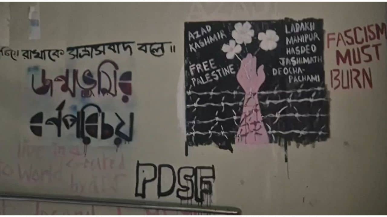 কলকাতা: গত কয়েকদিন ধরে উত্তপ্ত যাদবপুর বিশ্ববিদ্যালয়ে এবার দেওয়াল লিখন ঘিরে বিতর্ক। যাদবপুর বিশ্ববিদ্যালয়ের ৩ নম্বর গেটের কাছে লেখা হয়েছে আজাদ কাশ্মীরের স্লোগান। মুক্ত প্যালেস্তাইনেরও দাবি জানানো হয়েছে। এই দেওয়াল লিখনের নিচে লেখা রয়েছে অতি বাম ছাত্র সংগঠন পিডিএসএফ-র নাম। আর এই দেওয়াল লিখন ঘিরেই শুরু হয়েছে বিতর্ক।