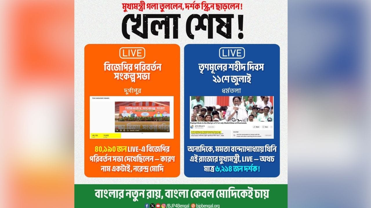 গত ১৮ জুলাই দুর্গাপুরে সভা করে যান প্রধানমন্ত্রী নরেন্দ্র মোদী। আর এদিন ধর্মতলায় তৃণমূলের শহিদ দিবসের সমাবেশ ছিল। দুই দলেরই সভা সোশ্যাল মিডিয়ায় লাইভ হয়েছিল। এদিন প্রথমে এক্স হ্যান্ডলে একটি পোস্ট করে রাজ্য বিজেপি। সেখানে তারা বলে, যখন মোদী বলেন, বাংলা শোনে। আর যখন মমতা বলেন, তখন দর্শক স্ক্রিন ছাড়লেন।