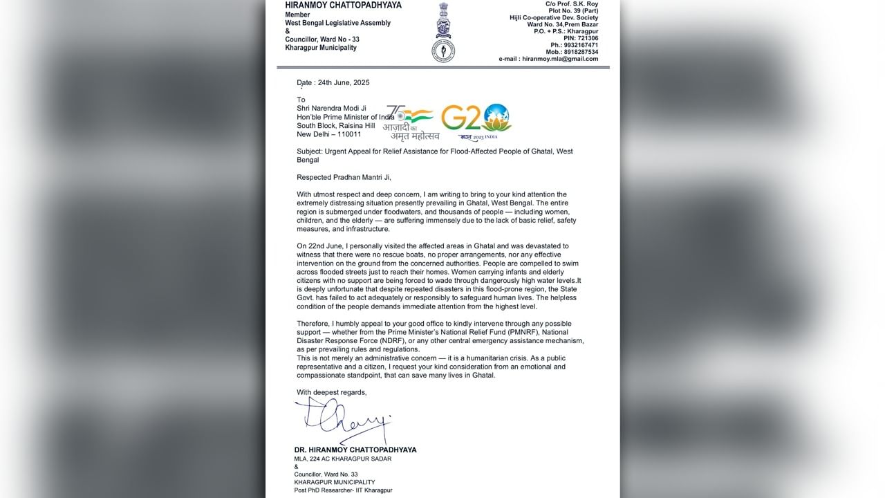 কলকাতা ও ঘাটাল: বর্ষা এলেই প্লাবিত হয় ঘাটাল ও সংলগ্ন এলাকা। দশকের পর দশক ধরে শোনা যায় ঘাটাল মাস্টারপ্ল্যানের কথা। তা বাস্তবায়ন না হওয়ায় কেন্দ্রের বিরুদ্ধে তোপ দেগে চলেছে রাজ্যের শাসকদল। এবার ঘাটালের বন্যা নিয়ে প্রধানমন্ত্রী নরেন্দ্র মোদীকে চিঠি লিখলেন বিজেপি বিধায়ক হিরণ চট্টোপাধ্যায়। যুক্তরাষ্ট্রীয় কাঠামোয় সম্ভব হলে বন্যা বিধ্বস্ত ঘাটালের মানুষকে সাহায্যের জন্য প্রধানমন্ত্রীর কাছে আবেদন জানালেন খড়্গপুর সদরের বিজেপি বিধায়ক।