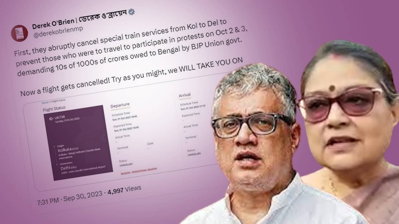 এক্স হ্যান্ডেলে এ নিয়ে সরব হয়েছেন ডেরেক ও’ব্রায়েন। লিখেছেন, ‘আগে এরা কলকাতা থেকে দিল্লিগামী ট্রেন বাতিল করেছে। ২ অক্টোবর, ৩ অক্টোবর দিল্লিতে তৃণমূলের প্রতিবাদ কর্মসূচি আছে। সেই কর্মসূচিতে অংশগ্রহণকারীরাই এই ট্রেনে যেতেন। দিল্লিতে গিয়ে নিজেদের প্রাপ্য দাবি করার কথা ছিল তাঁদের। এবার বিমান বাতিল করা হল। যত পারো চেষ্টা করো।’ উড়ান বাতিল সংক্রান্ত একটি মেসেজের স্ক্রিনশটও শেয়ার করেছেন ডেরেক।