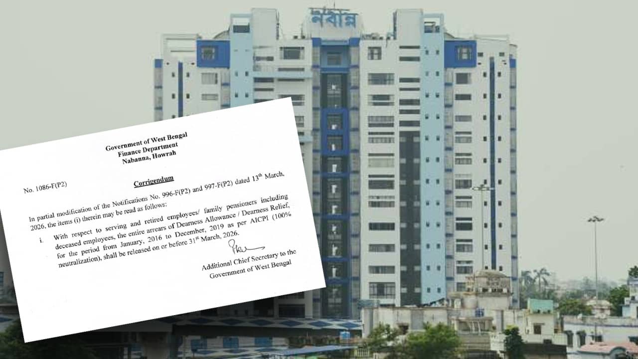 ওই বিজ্ঞপ্তিই সংশোধন করল নবান্ন। এবার নবান্ন জানিয়ে দিল, রাজ্য সরকারি কর্মী ও অবসরপ্রাপ্তদের ওই চার বছরের বকেয়া মহার্ঘ ভাতা (DA) এক দফাতেই দেওয়া হবে। দু’দফায় নয়। অর্থ দফতরের জারি করা নির্দেশিকা অনুযায়ী, ২০১৬ জানুয়ারি থেকে ২০১৯ ডিসেম্বর পর্যন্ত ১০০ শতাংশ বকেয়া ৩১ মার্চের মধ্যে দেওয়া হবে।