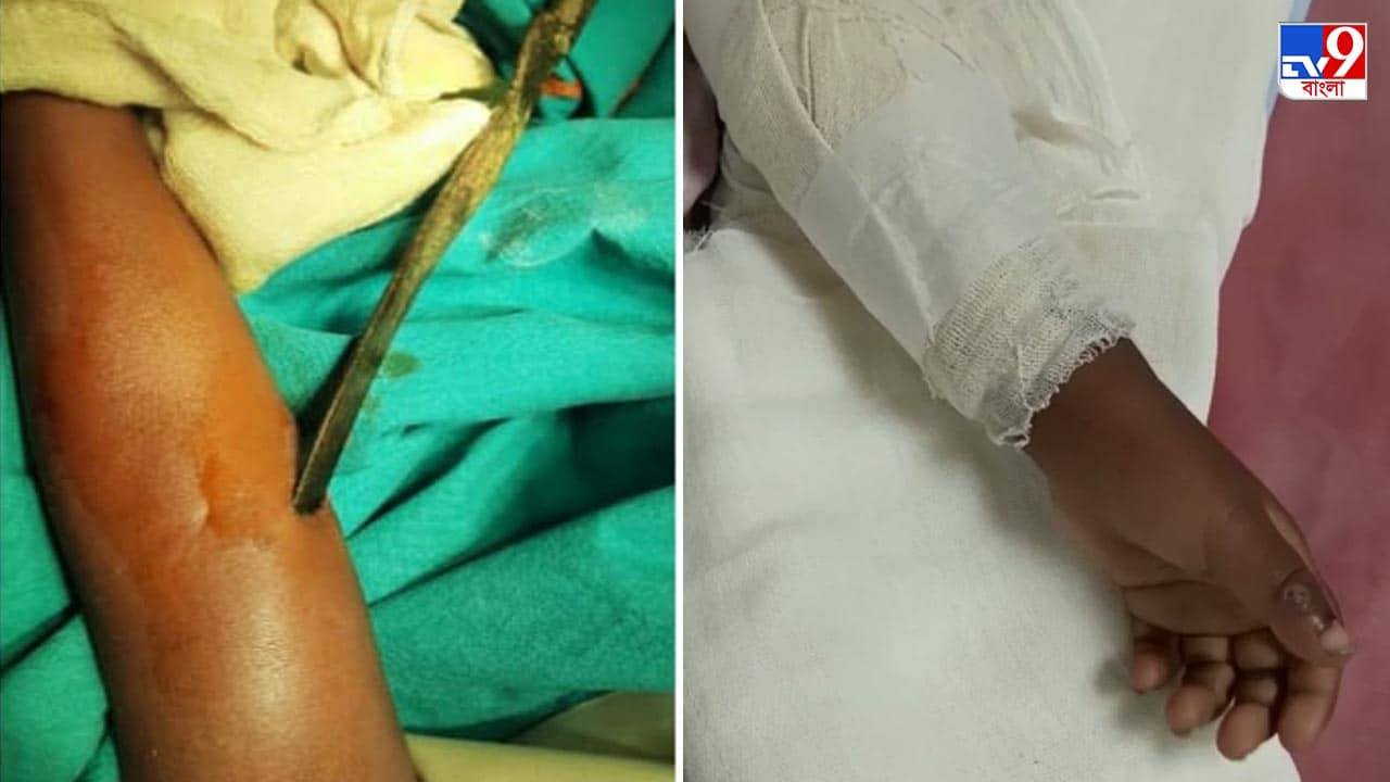 কলকাতা: মাঠে চাষের কাজ সেরে বাড়িতে এসে খেতে বসেছিলেন বাবা। আচমকা এক মাত্র পুত্রের তারস্বরে কান্না। কী হয়েছে দেখতে গিয়ে উঠে গিয়ে চমকে ওঠেন তিনি। চাষের কাস্তেটা (Sickle) ছেলের বাঁ হাত ফুঁড়ে ঢুকে রয়েছে যে! সে ভাবেই তিন বছরের ছেলে বসে রয়েছে। ভাত থালা পড়ে রইল ওভাবেই। ছেলেকে নিয়ে দু’ দুটো হাসপাতাল ঘুরে অবশেষে কলকাতার এনআরএস হাসপাতালে (NRS Hospital) নিয়ে আসেন নদিয়ার তাহেরপুর থানার বাসিন্দা গৌর হালদার। জটিল অস্ত্রোপচারে রক্ষা পেল শিশুর বাঁ হাত। হাঁফ ছাড়লেন বাবা-মা।