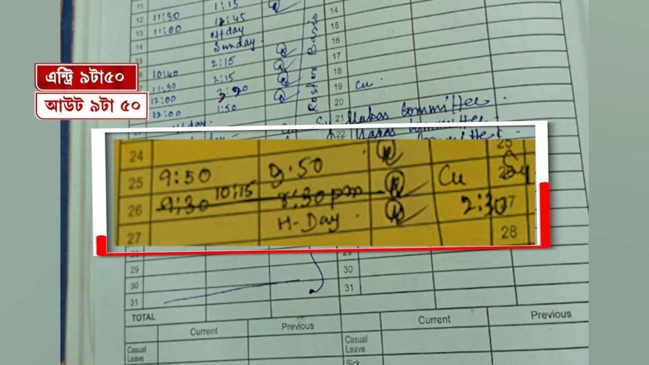 কসবার ওই কলেজের রেজিস্ট্রারে দেখা যাচ্ছে, ৯ টা ৫০ মিনিটে তিনি ঢোকেন এবং ৯ টা ৫০ মিনিটেই কলেজ ছাড়েন! টিভি নাইন বাংলার হাতে সেই রেজিস্টারের ছবি।