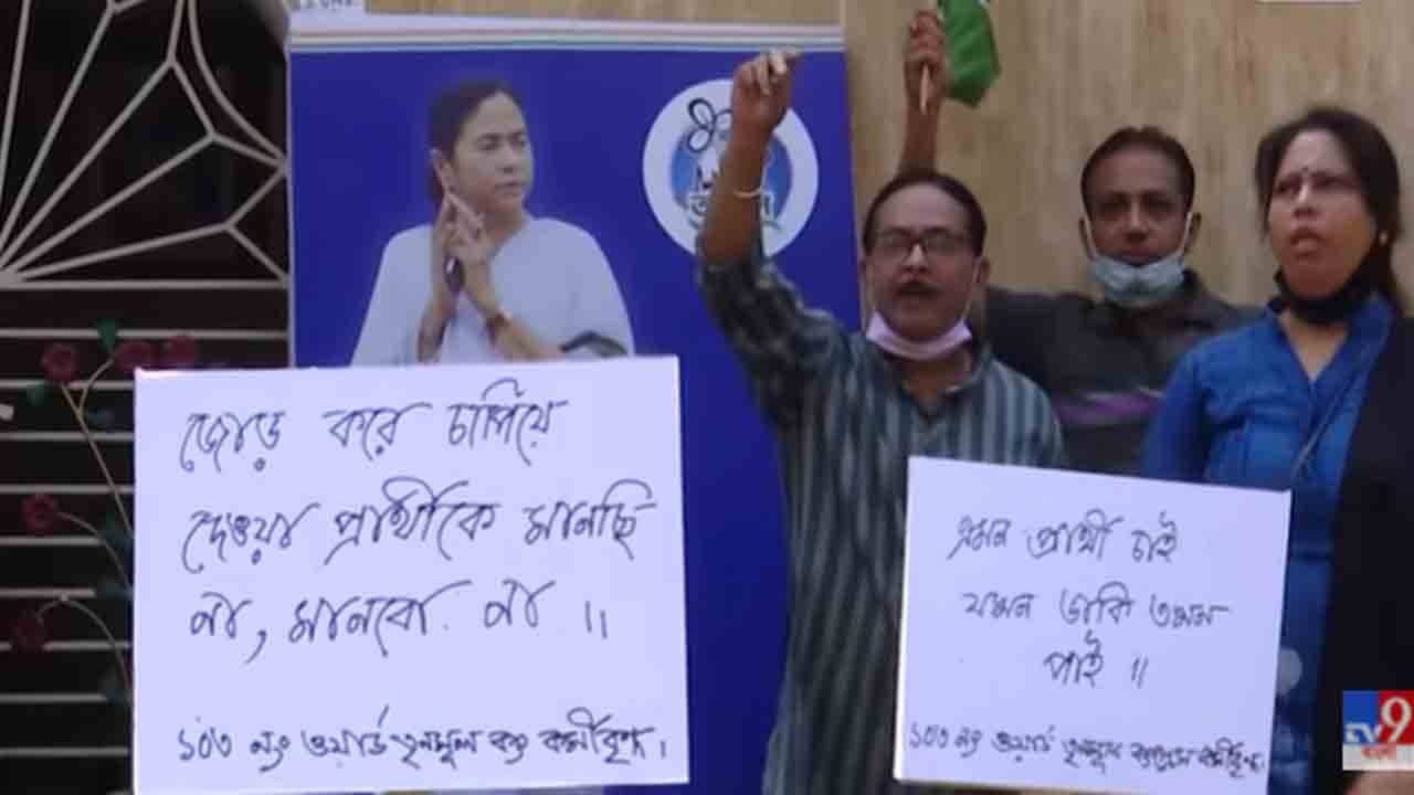 এদিন সকাল থেকে সন্তোষপুর লেকপল্লির সামনে প্ল্যাকার্ড, দলীয় পতাকা নিয়ে বসে পড়েন দলের কর্মীরা। কোনওটায় লেখা, ‘জোর করে চাপিয়ে দেওয়া প্রার্থী মানছি না’, কোনওটায় আবার লেখা, ‘এমন প্রার্থী চাই, যখন ডাকি তখন পাই’। সঙ্গে ছিল মমতা বন্দ্যোপাধ্যায়ের ছবিও। ১০৩ নম্বর ওয়ার্ডের তৃণমূল কর্মীদের দাবি, দল এমন কাউকে প্রার্থী করুক যিনি দলের সর্বক্ষণের কর্মী।
