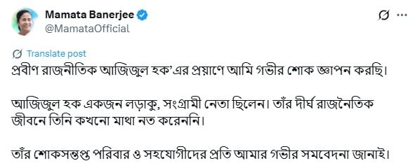 কলকাতা: বাম চিন্তাবিদ আজিজুল হক প্রয়াত। সোমবার দুপুরে সল্টলেকের এক বেসরকারি হাসপাতালে মৃত্যু হয় তাঁর। বেশ কিছুদিন ধরেই অসুস্থ ছিলেন প্রবীণ বামপন্থী চিন্তাবিদ আজিজুল হক। কয়েক দিন আগেই ভর্তি করানো হয় বেসরকারি হাসপাতালে। রবিবার অবস্থার অবনতি হলে ভেন্টিলেশন সাপোর্ট দেওয়া হয়। সোমবার দুপুর ২.২৮ মিনিটে সব শেষ! তাঁর প্রয়াণে শোক প্রকাশ করেছেন মুখ্যমন্ত্রী মমতা বন্দ্যোপাধ্যায়।