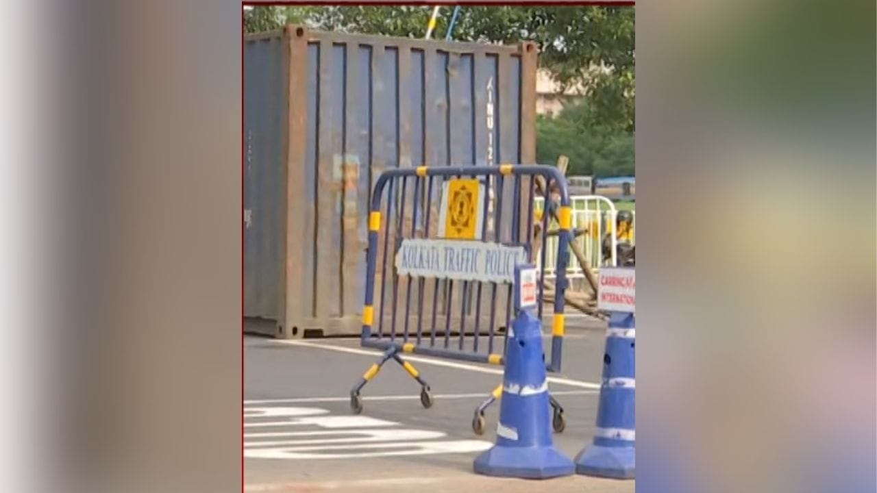 ধাপে ধাপে ব্যারিকেড দেওয়া হয়েছে রাস্তায়। শুধু ব্যারিকেড নয়, রাস্তা খুঁড়ে লোহার রড বসানো থেকে শুরু করে কন্টেনার রাখা হয়েছে। প্রস্তুত রাখা হয়েছে জলকামানও। উপস্থিত রয়েছেন লালবাজারের উচ্চপদস্থ কর্তারাও। নবান্নের অভিমুখে এগিয়ে যাওয়া মিছিলকে আটকাবে গার্ডরেল ও ব্যারিকেড। একটার উপরে আরেকটা ব্যারিকেড দিয়ে দুইজন মানুষের উচ্চতা সমান ব্যারিকেড তৈরি করা হয়েছে।