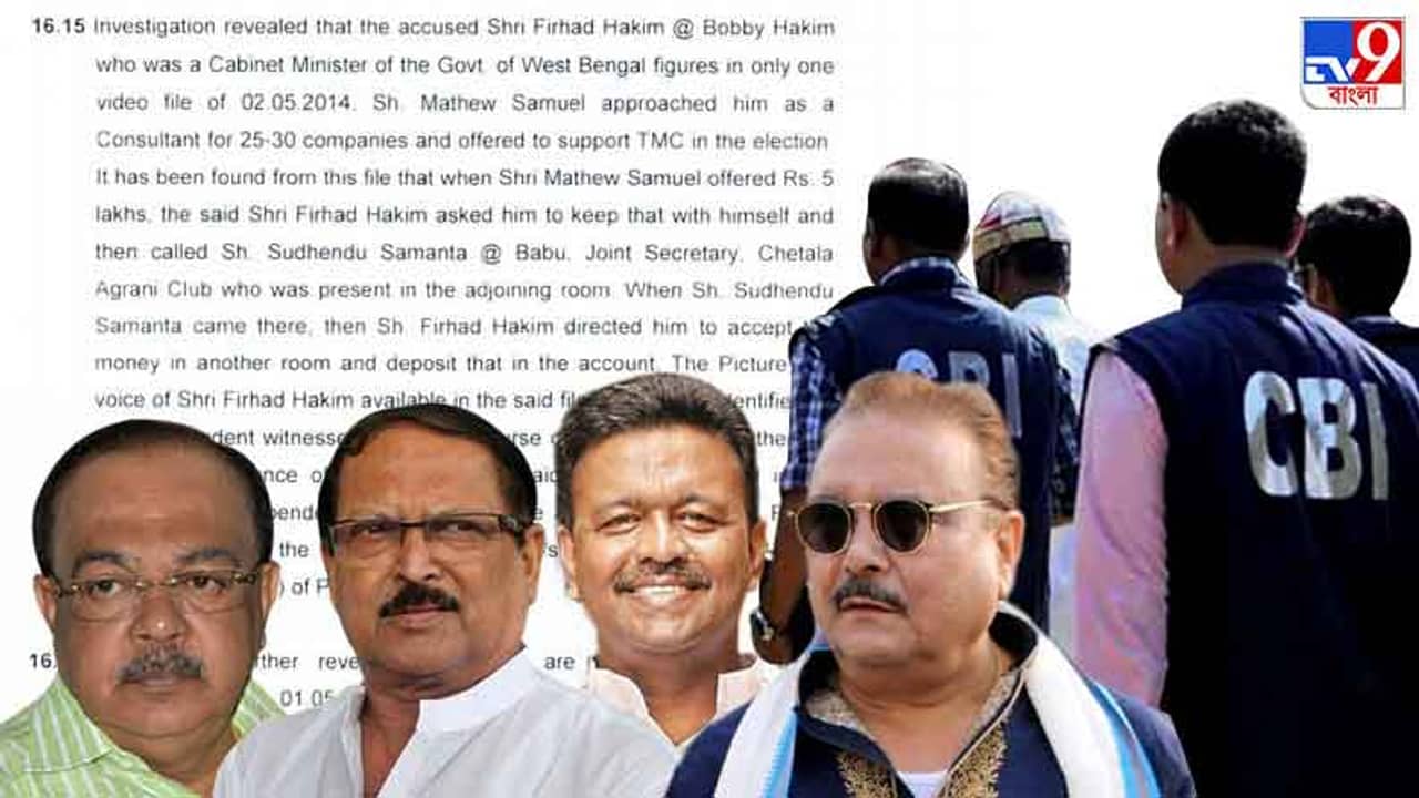 চার্জশিটে সিবিআই ফিরহাদের হাকিমের নাম উল্লেখ করে লিখেছে, “২০১৪ সালে ২ মে-র ভিডিয়োতে ফিরহাদ হাকিমকে দেখা যাচ্ছে। শঙ্কর নায়ের বলে ব্যবসায়ী সেজে ম্যাথু স্যামুয়েল তাঁকে ৫ লক্ষ টাকা দেওয়ার প্রস্তাব দেন। সেখানে চেতলা অগ্রণী ক্লাবের জয়েন্ট সেক্রেটারি শুভেন্দু সামন্ত ওরফে বাবুকে ডাকেন ফিরহাদ। তাঁর হাতেই টাকা দিতে বলেন। ফিরহাদ হাকিম নির্দেশ দিচ্ছেন, সেই টাকা একটি নির্দিষ্ট অ্যাকাউন্টে জমা পড়ে।”